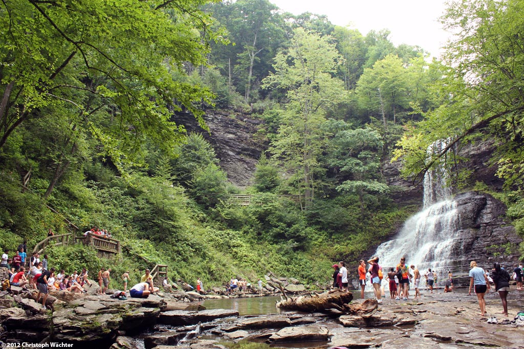 Gesamtüberblick über die Cascades und das untere Becken mitsamt diverser Wanderer.