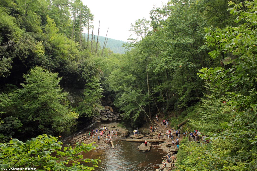 Das untere Becken der Cascades mitsamt Abfluss und dem unteren der beiden Wanderwege von oben aus gesehen.