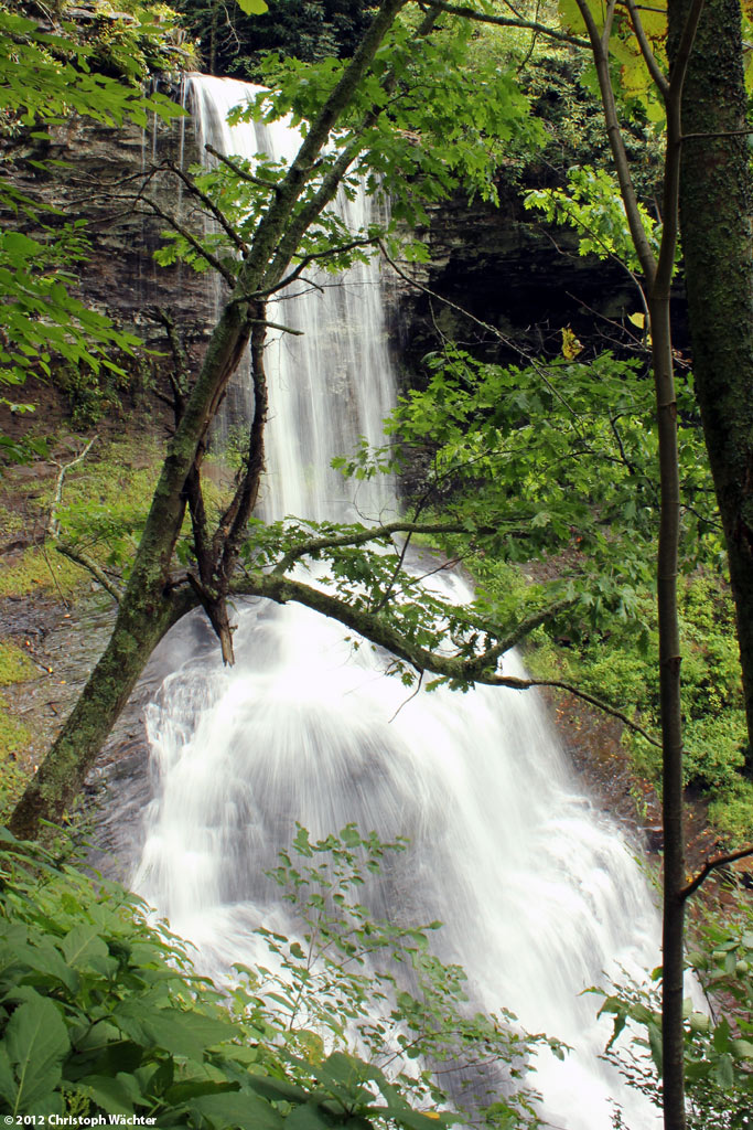 Der Wasserfall durch etwas Gebüsch und ein paar Bäume hindurch gesehen. Eine längere Belichtungszeit und größere Blende geben dem Bild diesen netten Effekt.