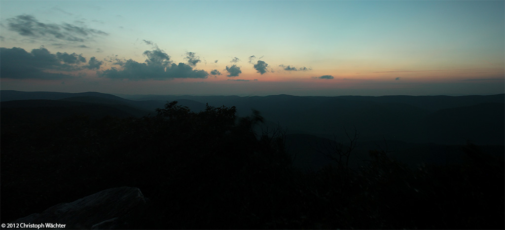Nachdem wir etwas Holz gesammelt hatten und ein kleines Lagerfeuer entzündet haben, bot sich die Gelegenheit dieser Panoramaaufnahme der Berge Richtung West/Nordwest (West Virgina) im äußerst fortgeschrittenen Abendrot. | ||